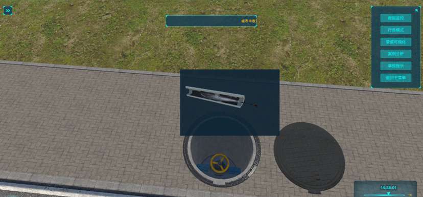 场景中出现消息提示:在旧城区中发生管道污渍沉积事件,请相关人员速到现场处理。学生通过数据监控画面判断堵塞位置,在正确的位置进行清洗操作。