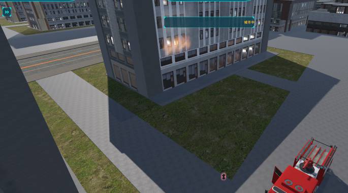 点击“消防灭火”后,播放动画,消防车从远处驶入指定位置(镜头跟随)。当消防车停下时,弹窗回答关于消防校核问答题。