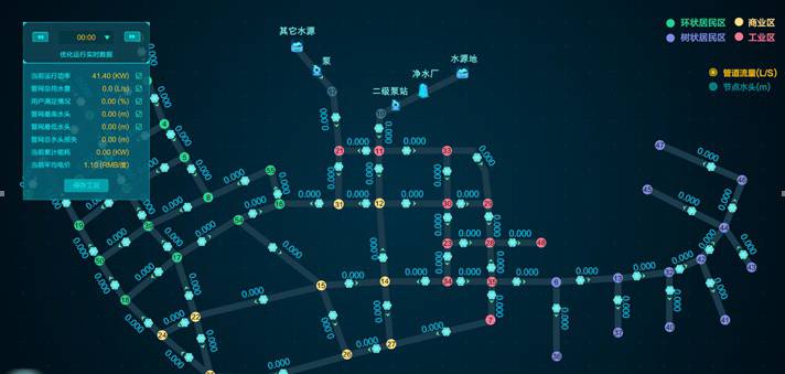 此模块的整体功能为在模拟满足用户用水量、水压的条件下,综合考虑水泵的运行特性、运行时间、阀门调度、蓄水设施调度,结合用水时变化系数的不同,去达到用户需求的情况下,设定成本或者泵的运行功率,寻找到一个周期内的运行最优方案,从而得出高效低耗的供水方式,减少供水的运行费用。