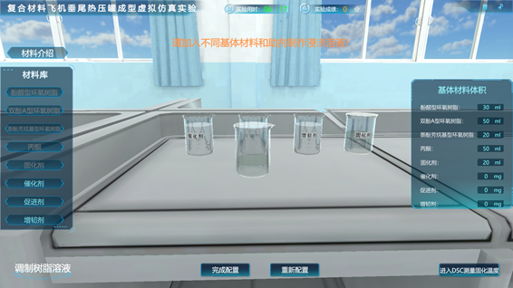 浸渍溶液的配置及检测;学生可以自由选择环氧树脂的含量配置浸渍溶液,使用差示扫描量热仪测量溶液的热性能曲线,热性能曲线作为热压罐成型工艺参数设定的指导。