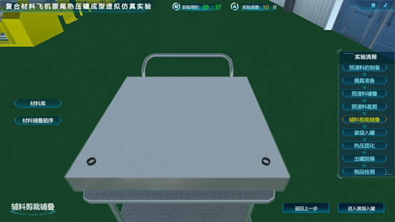 本虚拟仿真实验项目以复合材料飞机垂尾热压罐成型为原型,学生通过碳纤维增强环氧树脂基复合材料预浸料的制备和热压罐成型工艺参数搭建,掌握航空复合材料热压罐成型工艺的基本原理与技术要点,学会使用热压罐成型设备,掌握拟定热压罐成型工艺条件的方法。实验主要包含一下5个要点: