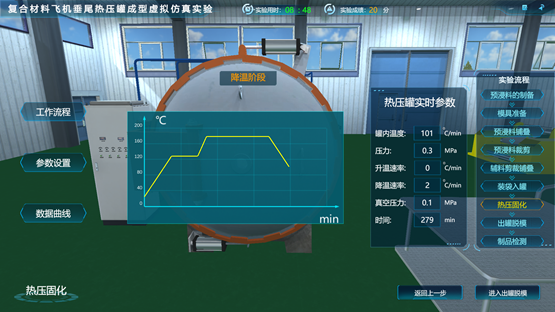 热压罐成型及缺陷检测;根据热性能曲线及生产工艺要求设定热压罐成型工艺参数,成型完成后,系统自动生成缺陷检测结果并给出缺陷原因,学生可重新设定工艺参数后再次进行热压罐成型。