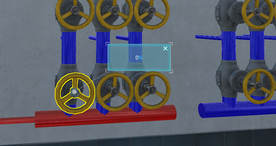 阀门操作:鼠标移动到阀门处,阀门变亮表示可以调节此阀门,单击阀门,显示该阀门开关状态。此时鼠标左右拖动,则进行数据调节,需要以1为单位来变化调节,鼠标向左拖动减少,向右拖动增加。